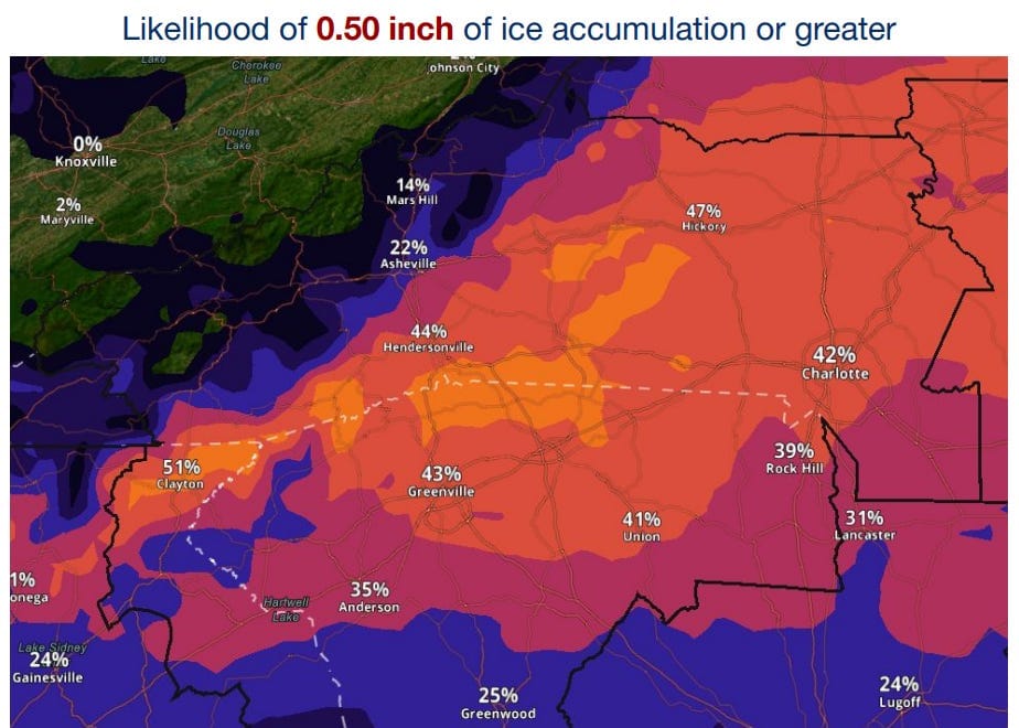 Instead, it’s looking more likely that the Charlotte region will be hit with ice, which is a problem because ice accumulations lead to power outages (in addition to slick roads).