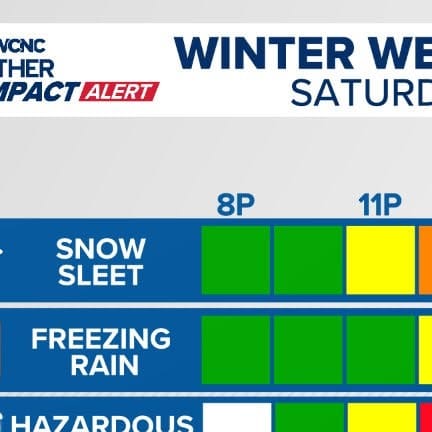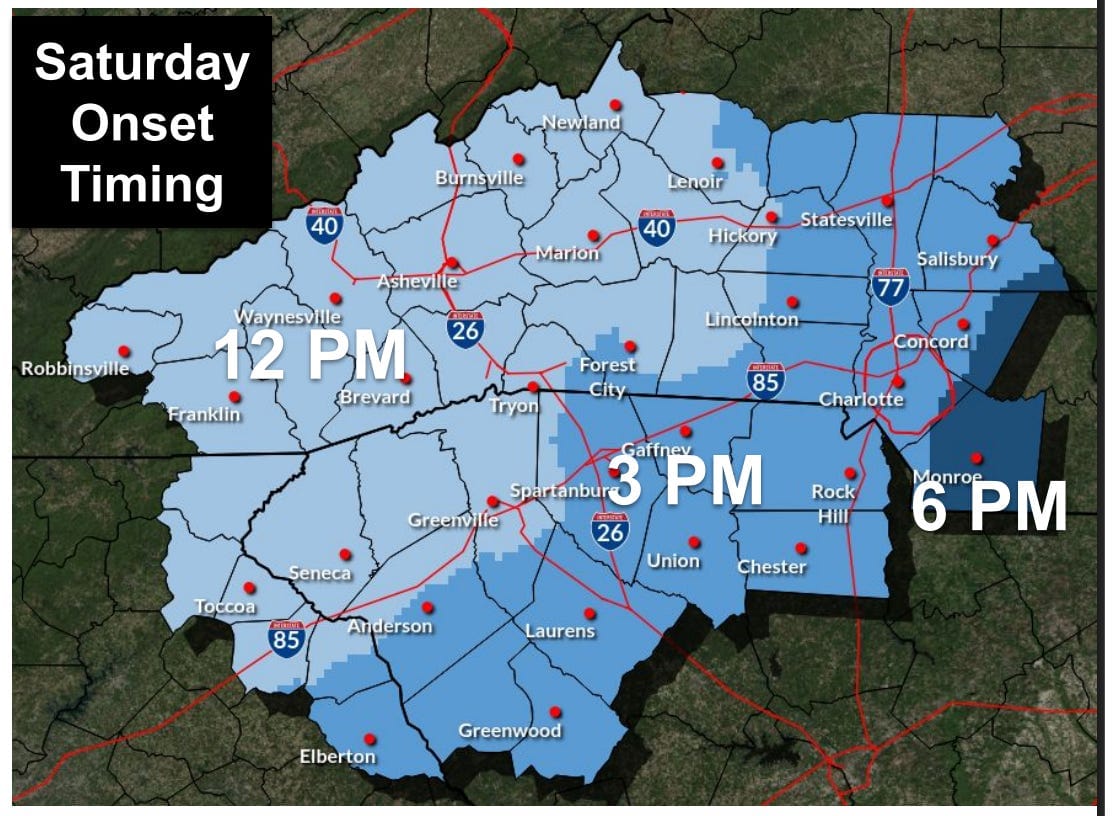 The latest forecasts expect sleet and ice to arrive in Charlotte in the late afternoon or early evening on Saturday.