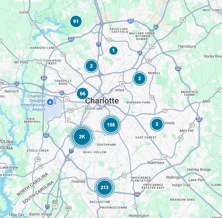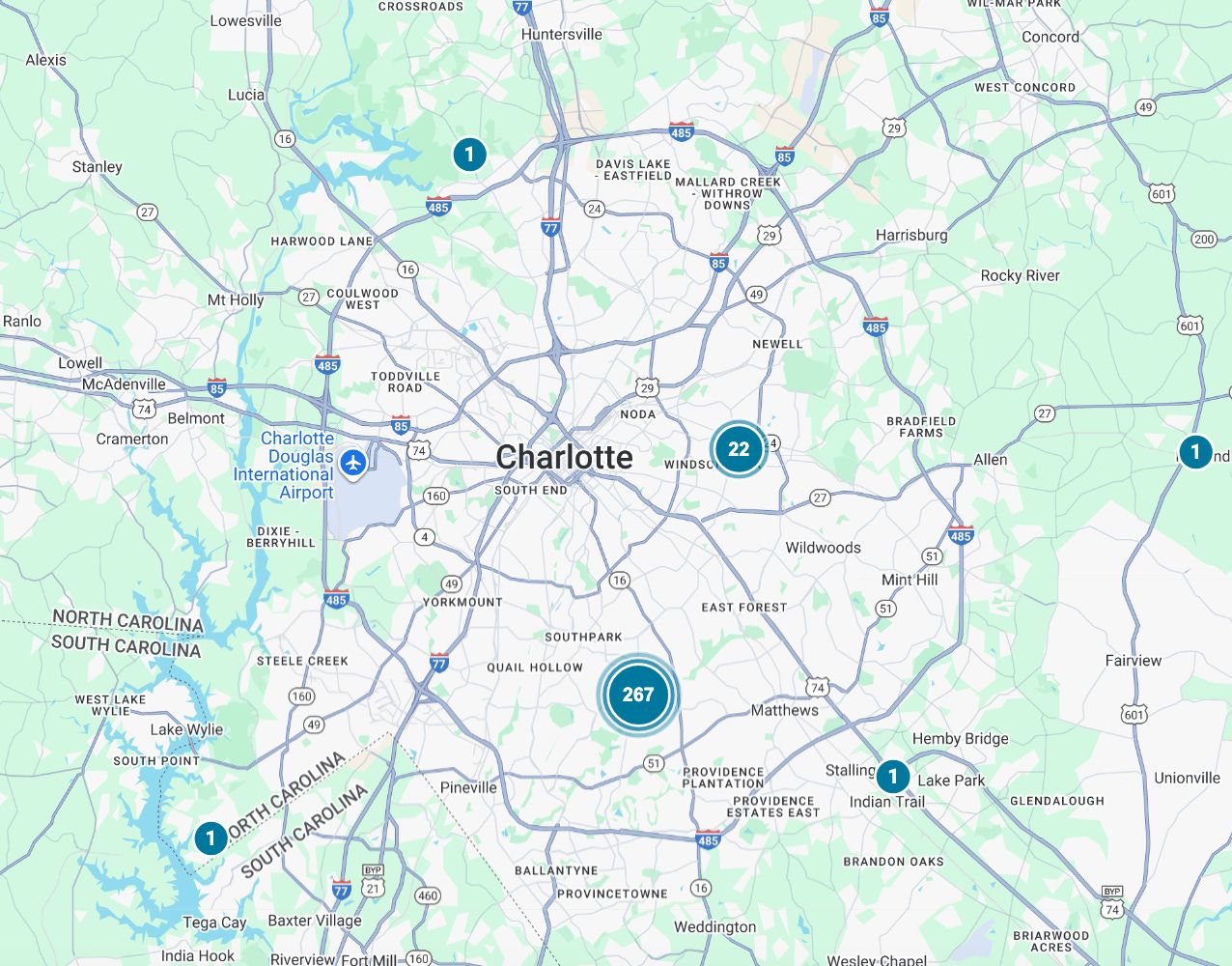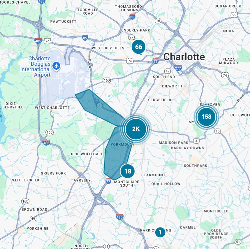Most of the outages seem to be in the Nations Ford Road corridor by Waddell High School and the Billy Graham Parkway corridor leading to the airport. Take a look: