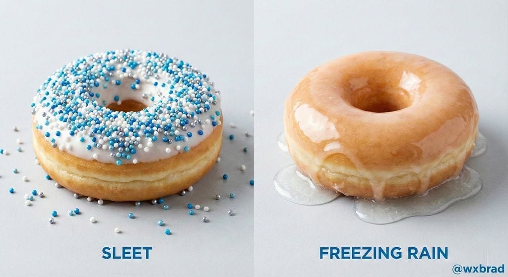 In true Brad Panovich fashion, the Charlotte meteorologist is using baked goods to explain the differences between sleet and freezing rain, which sound like the two main possibilities from this storm. He posted this one to social media on Thursday: