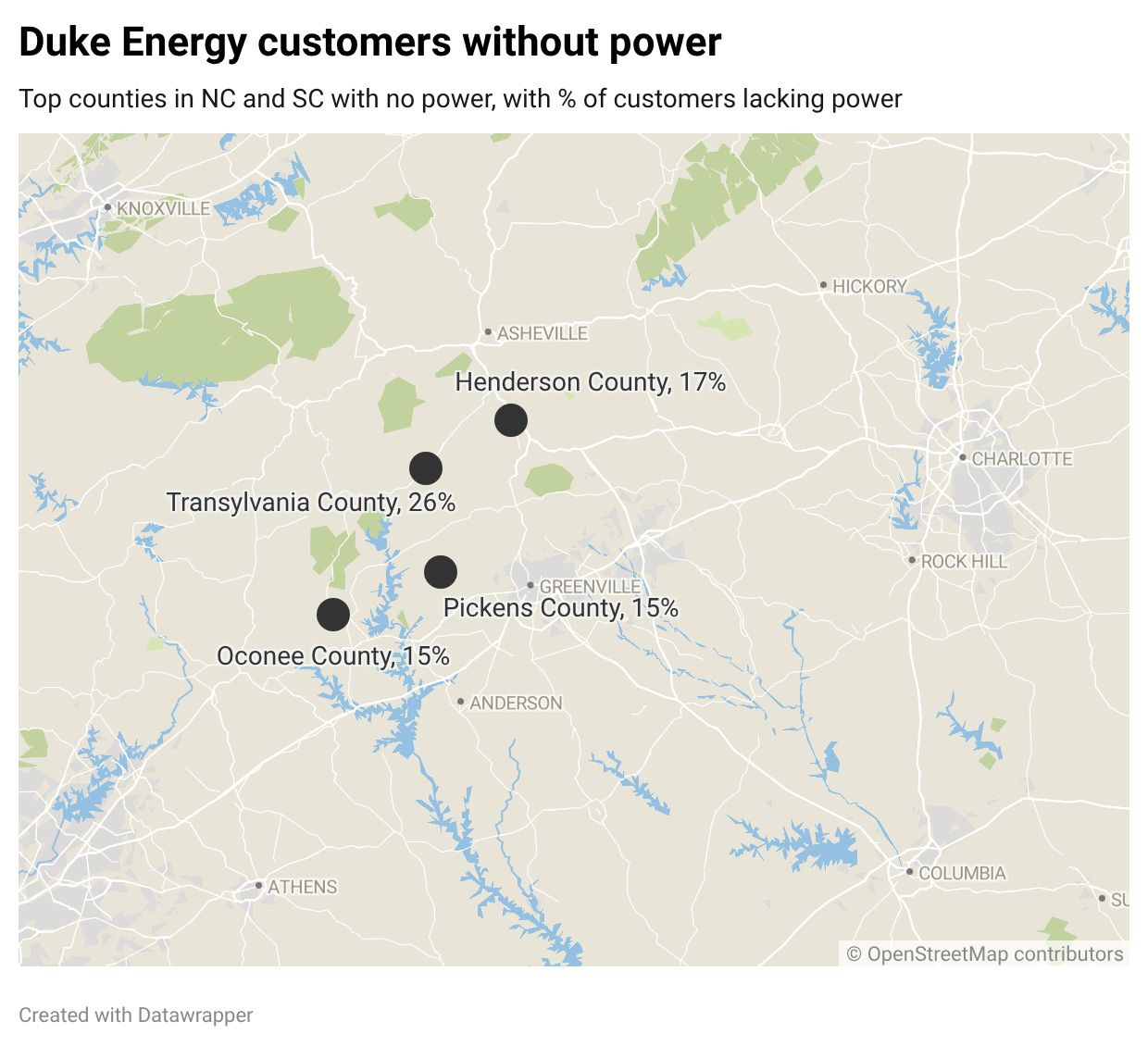 There are four counties in Western N.C. and Upstate S.C. that have 15% of more of Duke Energy customers without power as of 5:15 p.m., according to Duke Energy’s outage map.