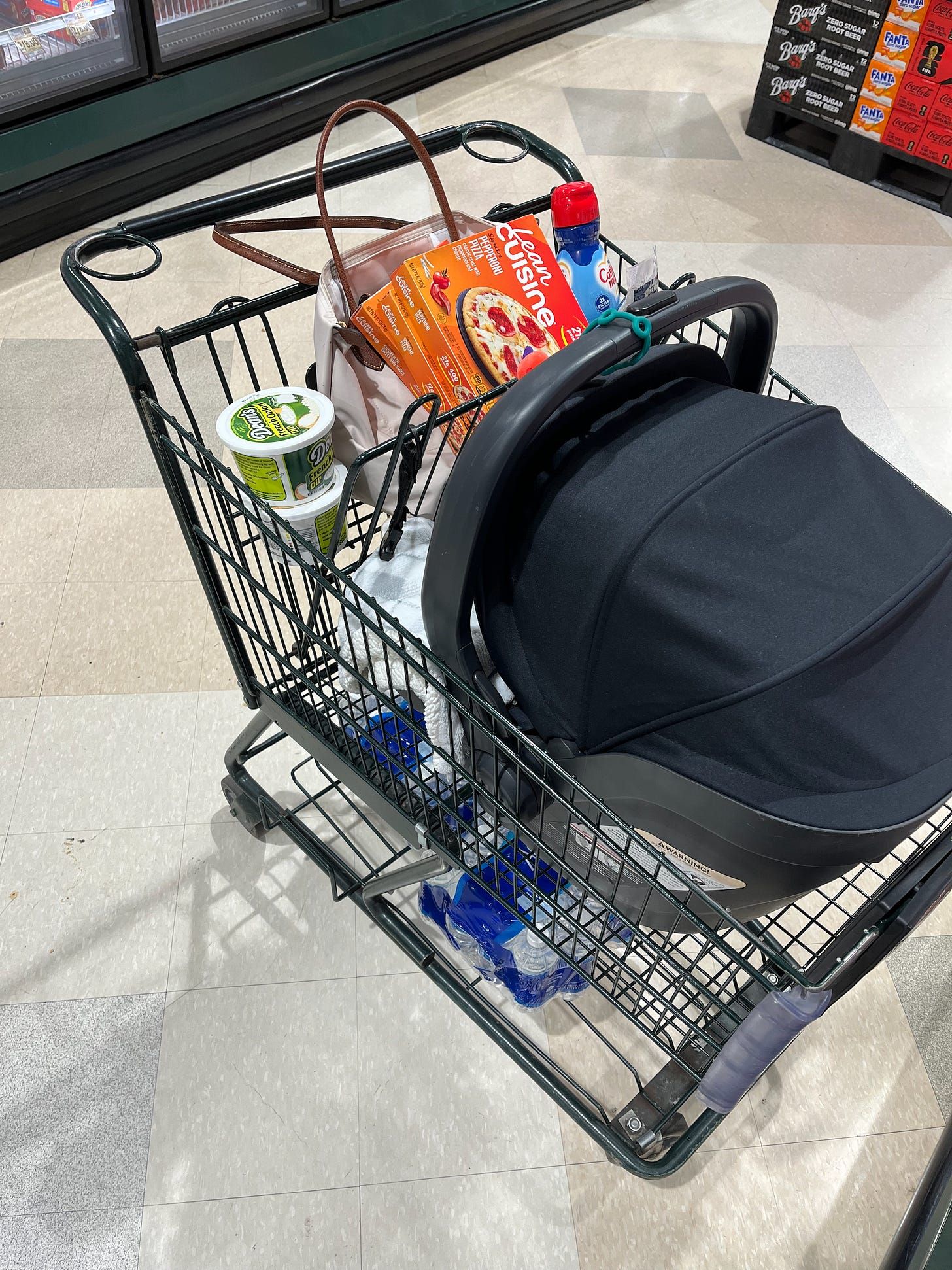The shopper, who also had a snoozing baby in a carrier, said it was especially important to stock up on water for infant formula.