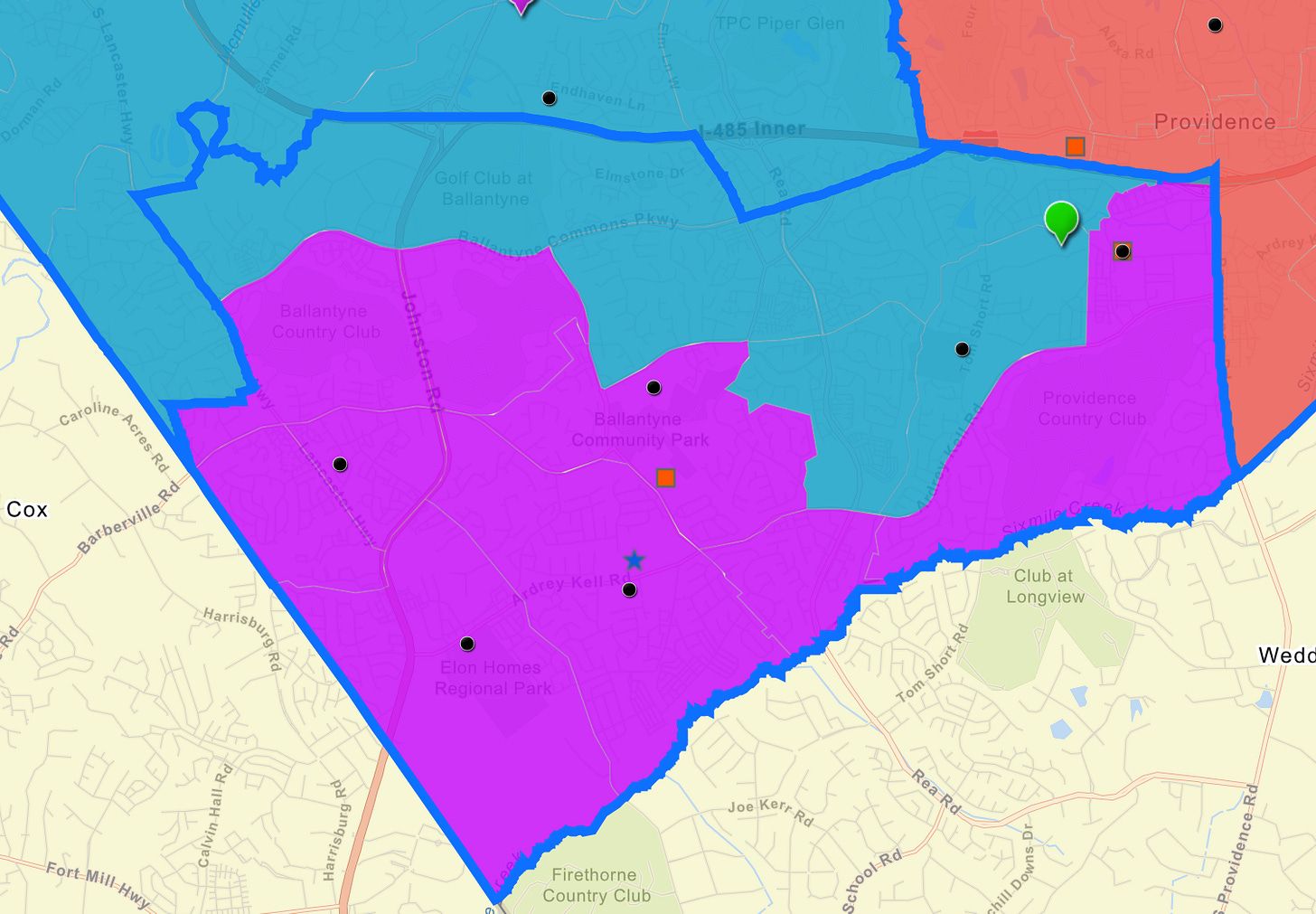 Here’s the latest draft of school assignment in the Ballantyne area. Blue line is current boundary. Purple is new Ardrey Kell, and blue is new high school as proposed: