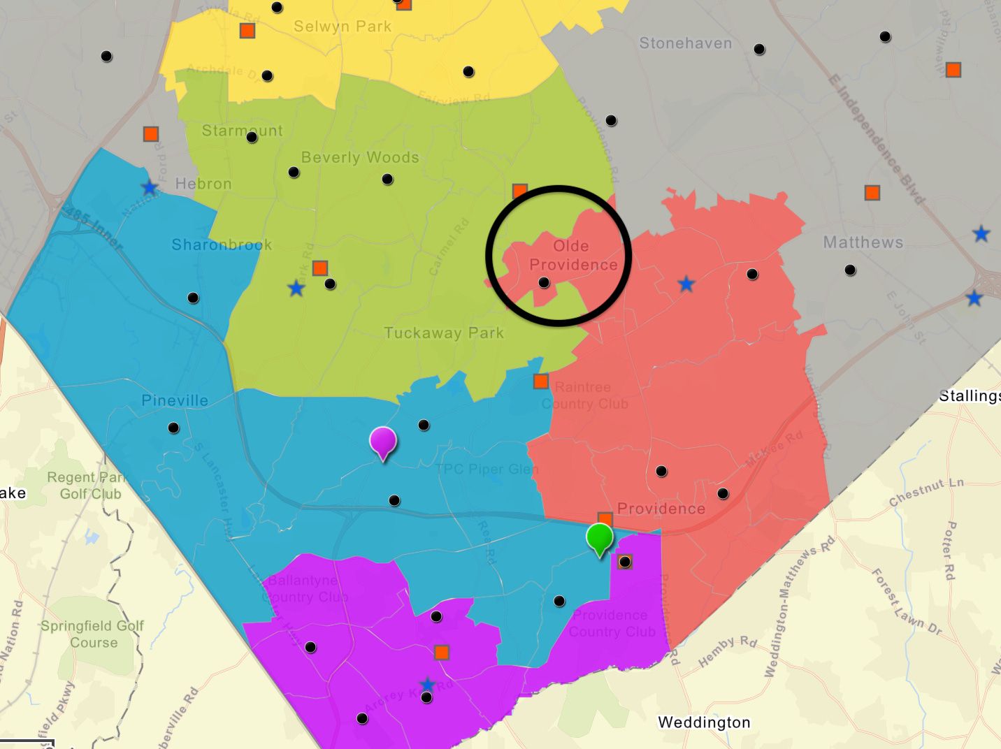 (Blue lines are current high school boundaries, green zone is new South Meck, red is new Providence, yellow is new Myers Park)