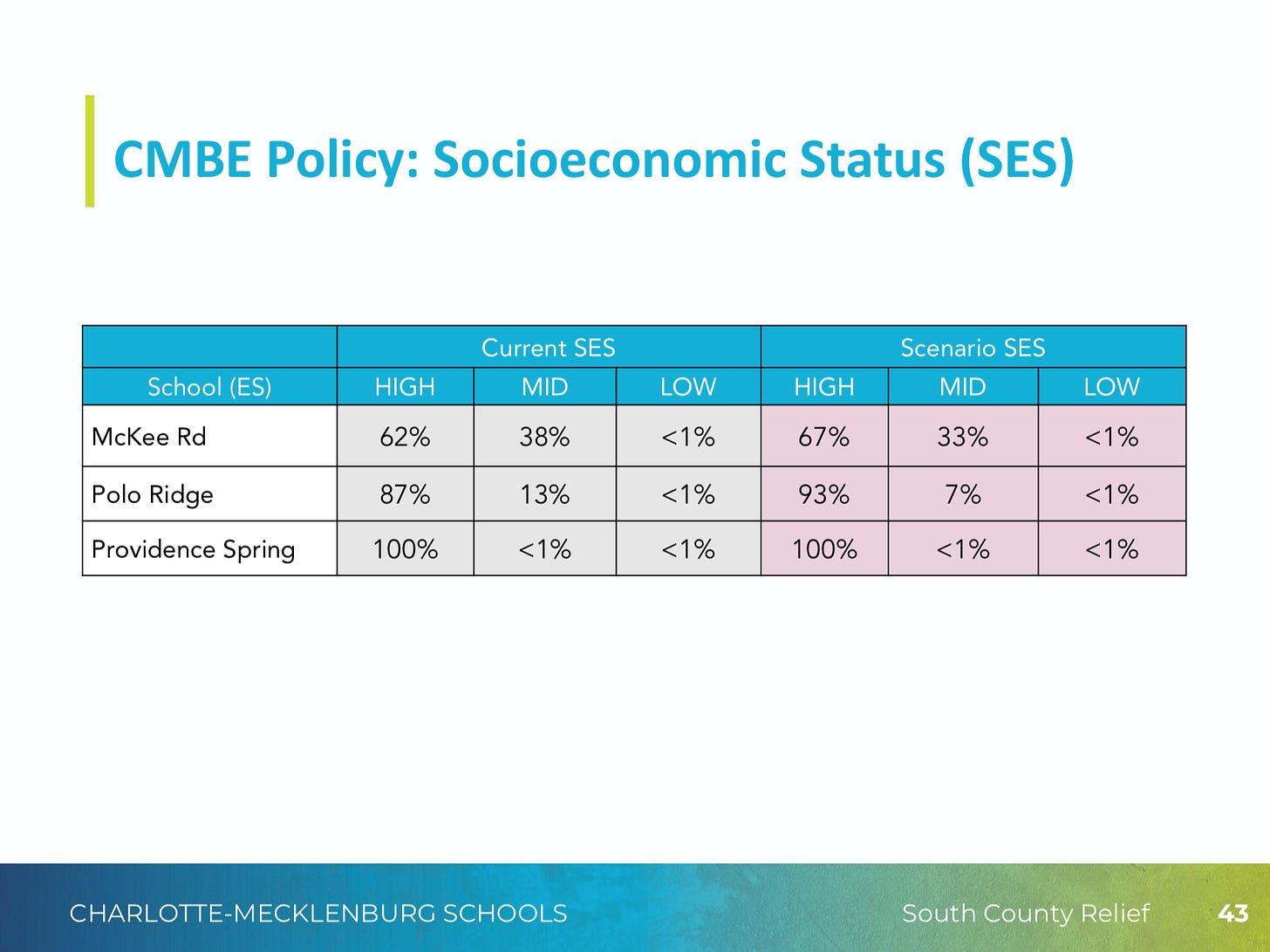 South Meck. Parents here were concerned in earlier drafts that there was too high a concentration of low socioeconomic status (SES) students. But now that figure is lower.