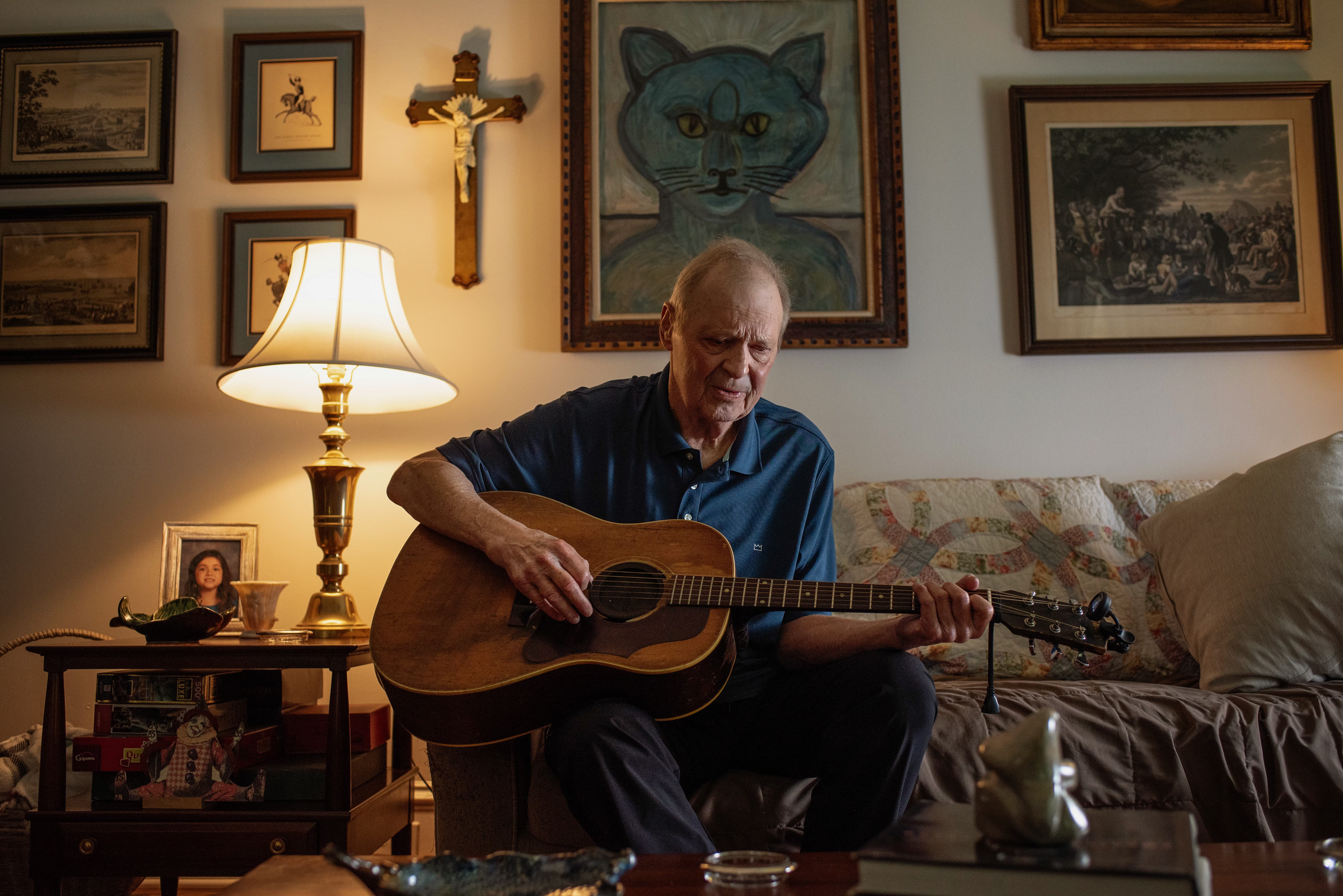 Surrounded by his art and a lifetime of stories, David Childers finds music in the light and shadows. The crucifix on the wall appears on the cover of his album, “Blessed in an Unusual Way.” (Photo courtesy of A.M. Stewart)