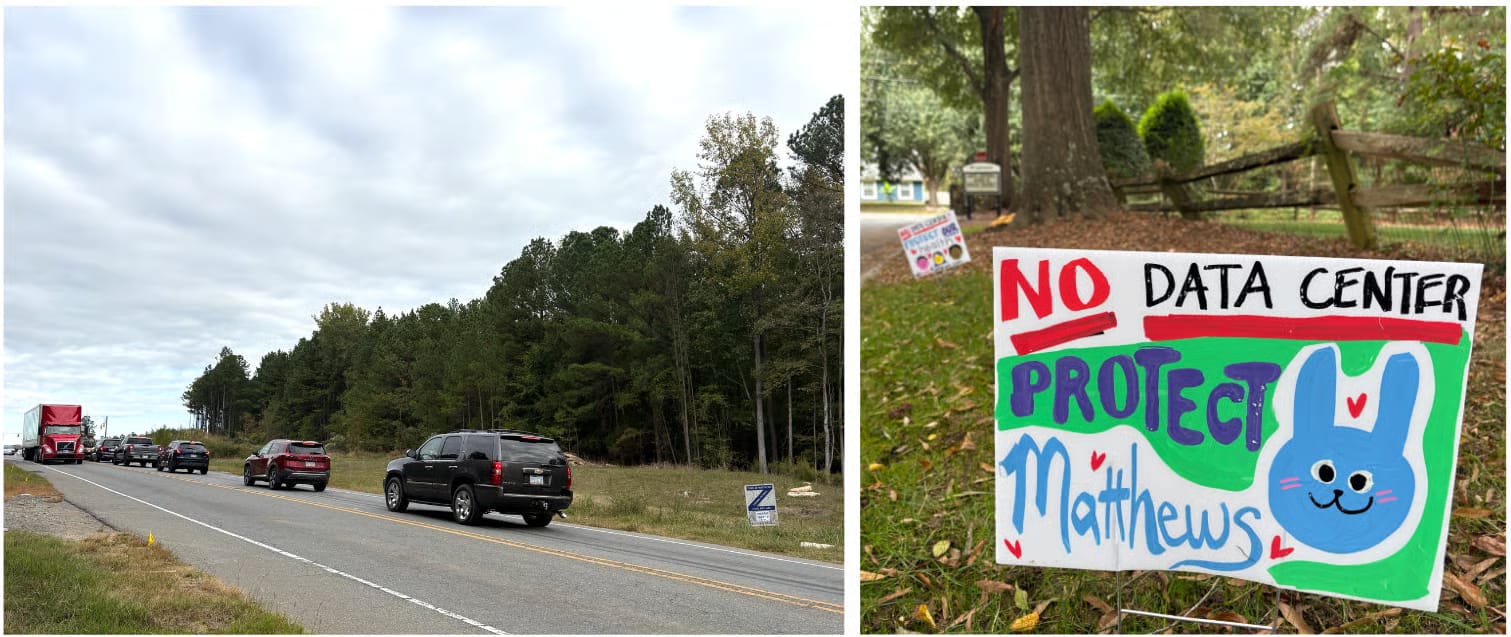 A proposed data center in Matthews last year (left) drew plenty of opposition (right) before being withdrawn. (Photos: Tony Mecia/The Charlotte Ledger)