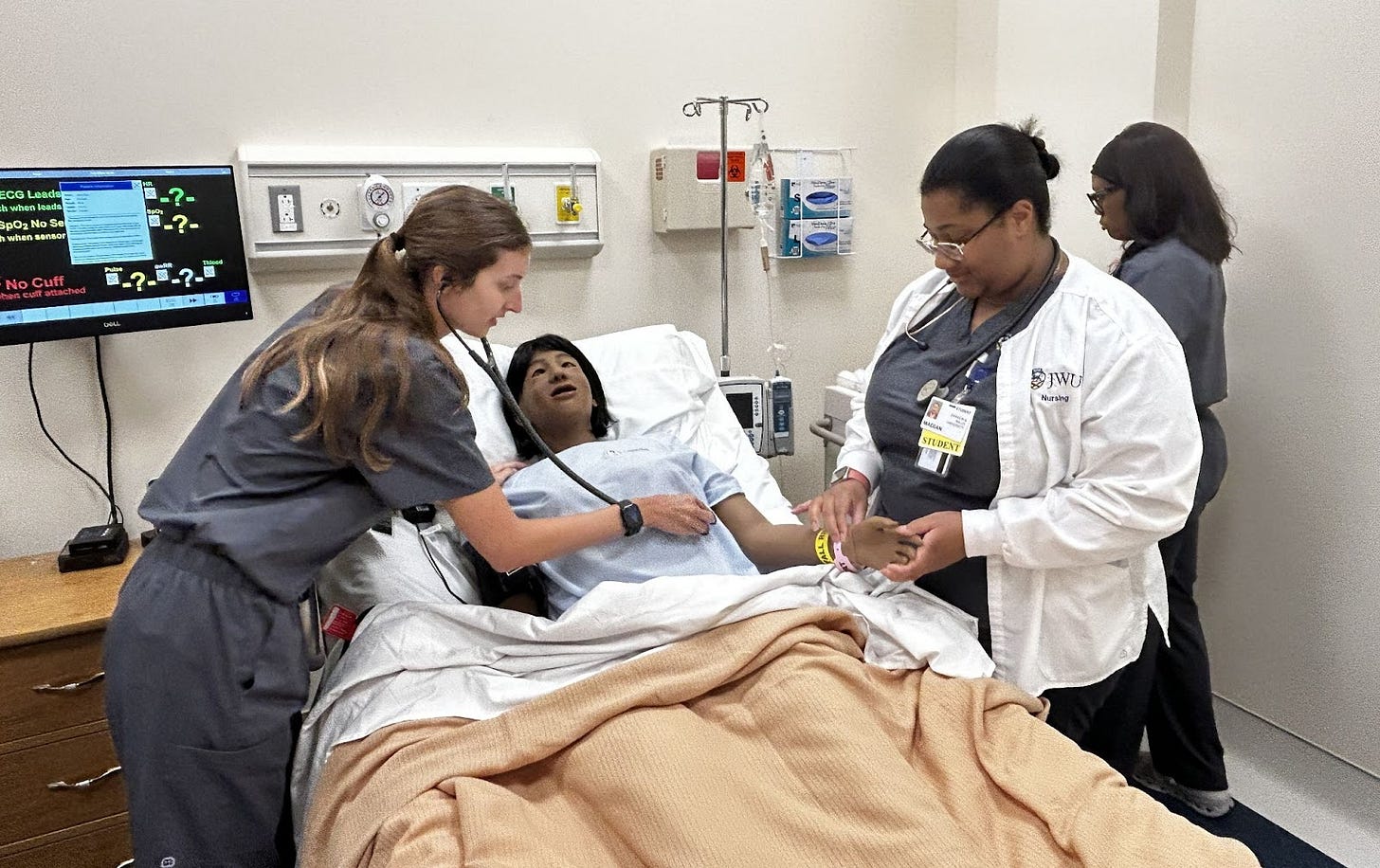 ROBO-PATIENT: Johnson & Wales University nursing students (L-R) Murphie Efird, Maegan Lord and Jessica Nichols complete an assessment on “Ann,” a high-tech simulator that can mimic medical conditions.