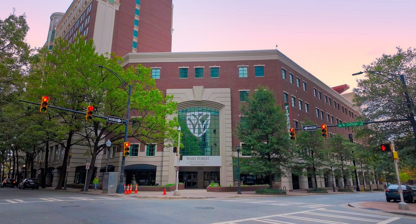 The Wake Forest University Charlotte Center building on North College Street was sold on Friday for $32.7M, according to the county register of deeds office. It previously sold for $72.5M in two transactions in 2013 and 2018.