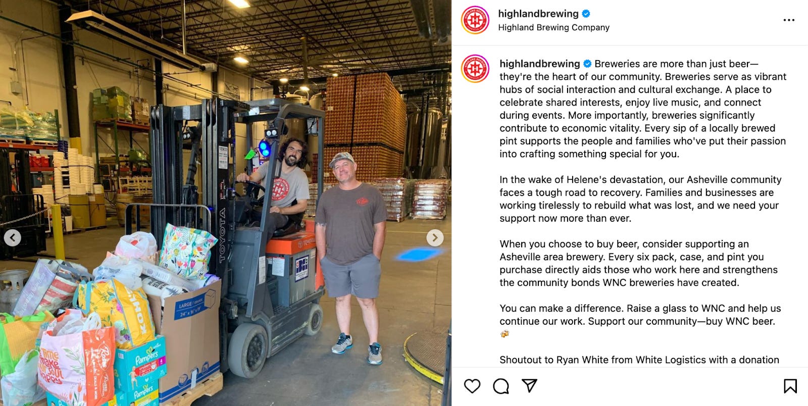 Highland — which had power restored on Oct. 3 but still doesn’t have running water — sits above the Swannanoa River. Over the past couple of weeks, the brewery has worked with a few relief organizations, including Beloved Asheville to set up a collection and distribution center; World Central Kitchen for food storage; Wine to Water to set up water systems training on water safety; Flush AVL to store non-potable water for flushing toilets; and the North Carolina Highway Patrol to store supplies for troopers.
