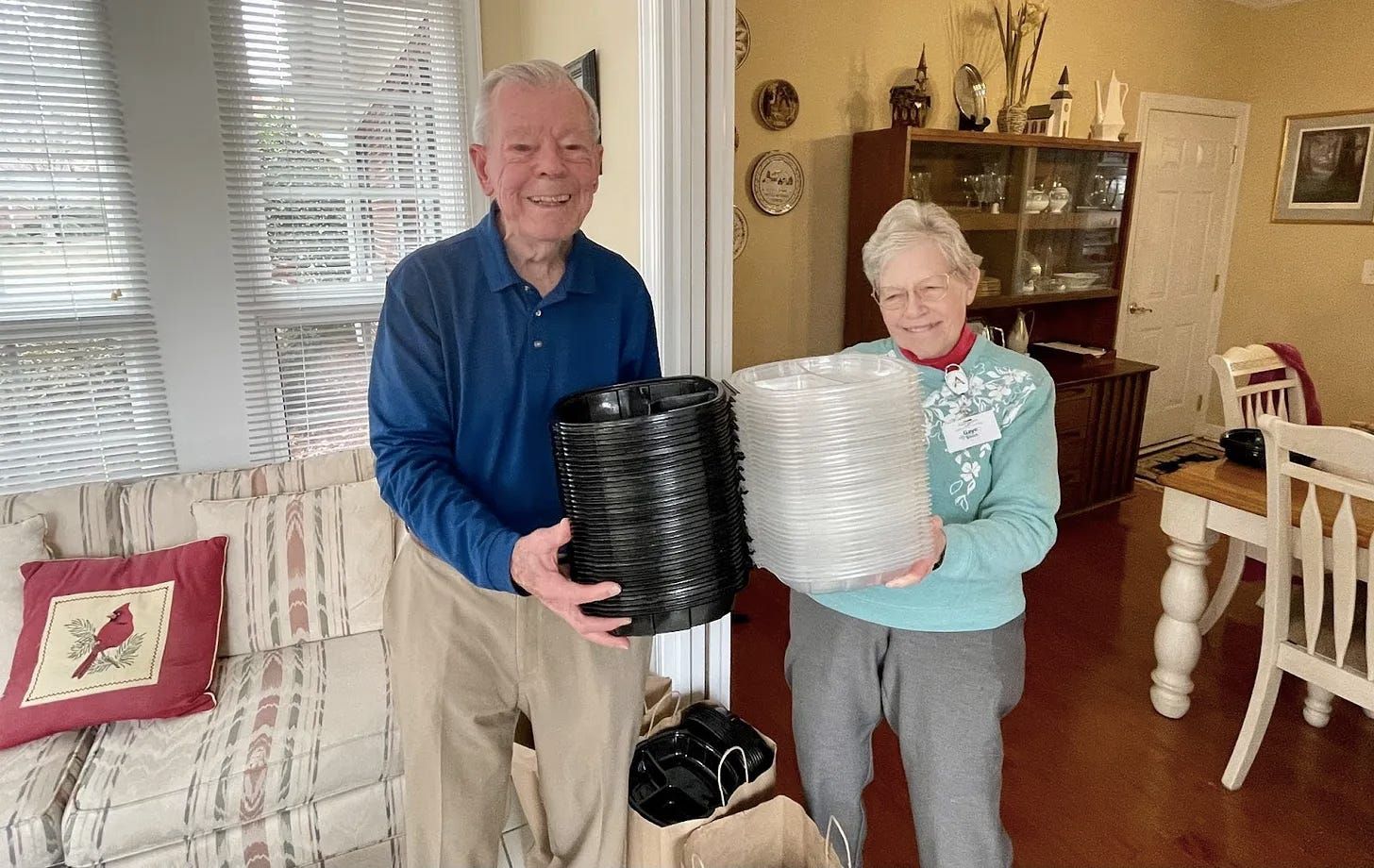 Most of the plastic items that Ted (left) and Gaye Smith collect are takeout trays from the dining areas at Aldersgate retirement community.