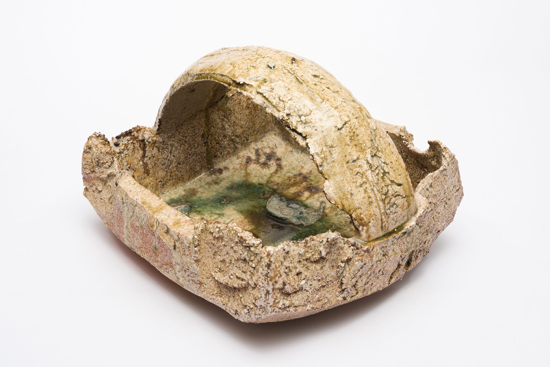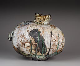 Take a few steps, and you come to Gareth Mason’s “Shadow Aghast.” What does the British artist want us to see in this complicated figure, made from stoneware, porcelain, feldspar, shards, layered slips and oxides, ironstone, copper and glaze? Is it a tribute to American face jugs, with apparently pursed lips and something bulging that could be an eye? Is it a blowfish, the fugu beloved by Japanese gourmets that’s poisonous when badly prepared? As so often in this exhibit, you apply your own interpretation.