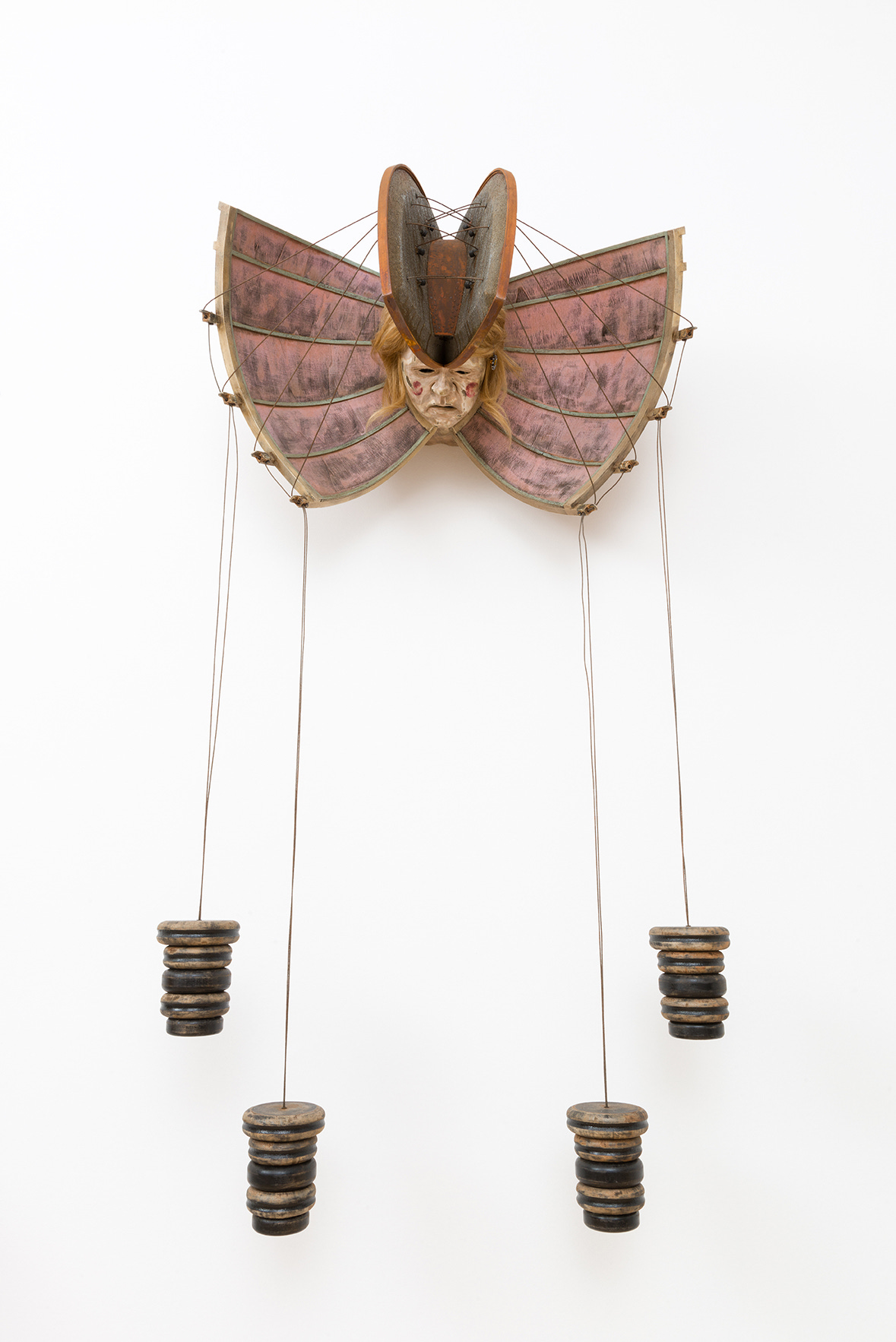 Some works are overt. Dustin Farnsworth’s multimedia “Maunder,” best seen from underneath, depicts a disconsolate girl forced by immense acoustic mirrors to listen to every sound in her world. These look like butterfly wings around her head, giving us the impression she’s an insect fatally pinned down by social media.