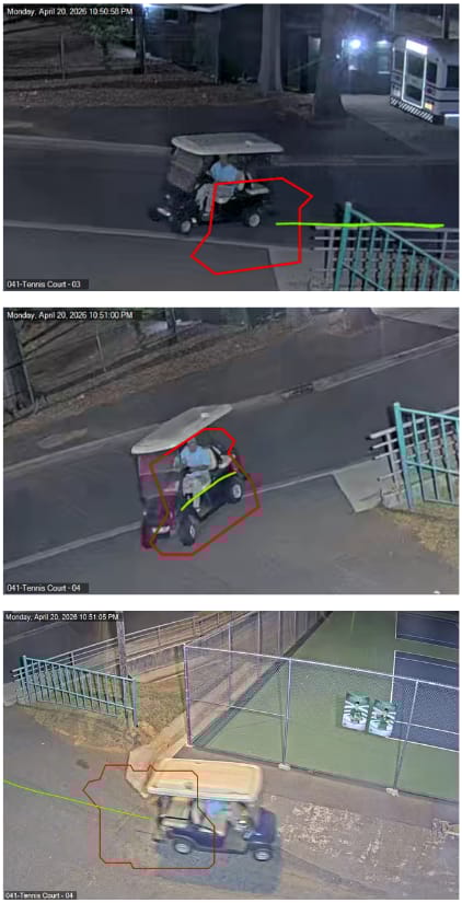 He also sent snapshots of video surveillance, marked at 10:51 p.m., and asked for help to “identify the male adult or golf cart”: