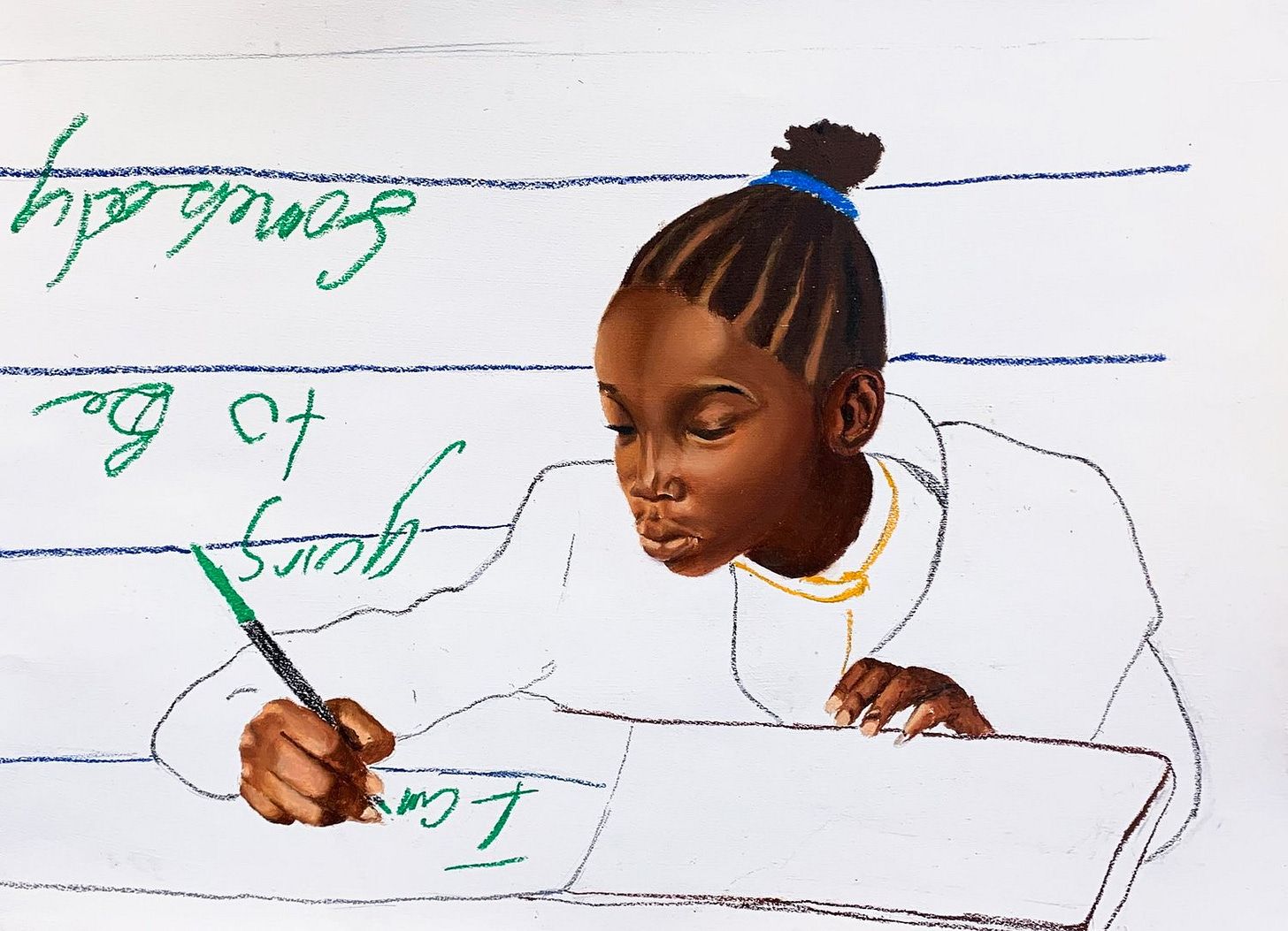 Parker Duncan’s portrait of a girl writing “I am going to be somebody” in her composition book seems straightforward until you learn the title: “Dear Future Single Mother.” Duncan is a portrait artist based in Charlotte. (Photo courtesy of the McColl Center)