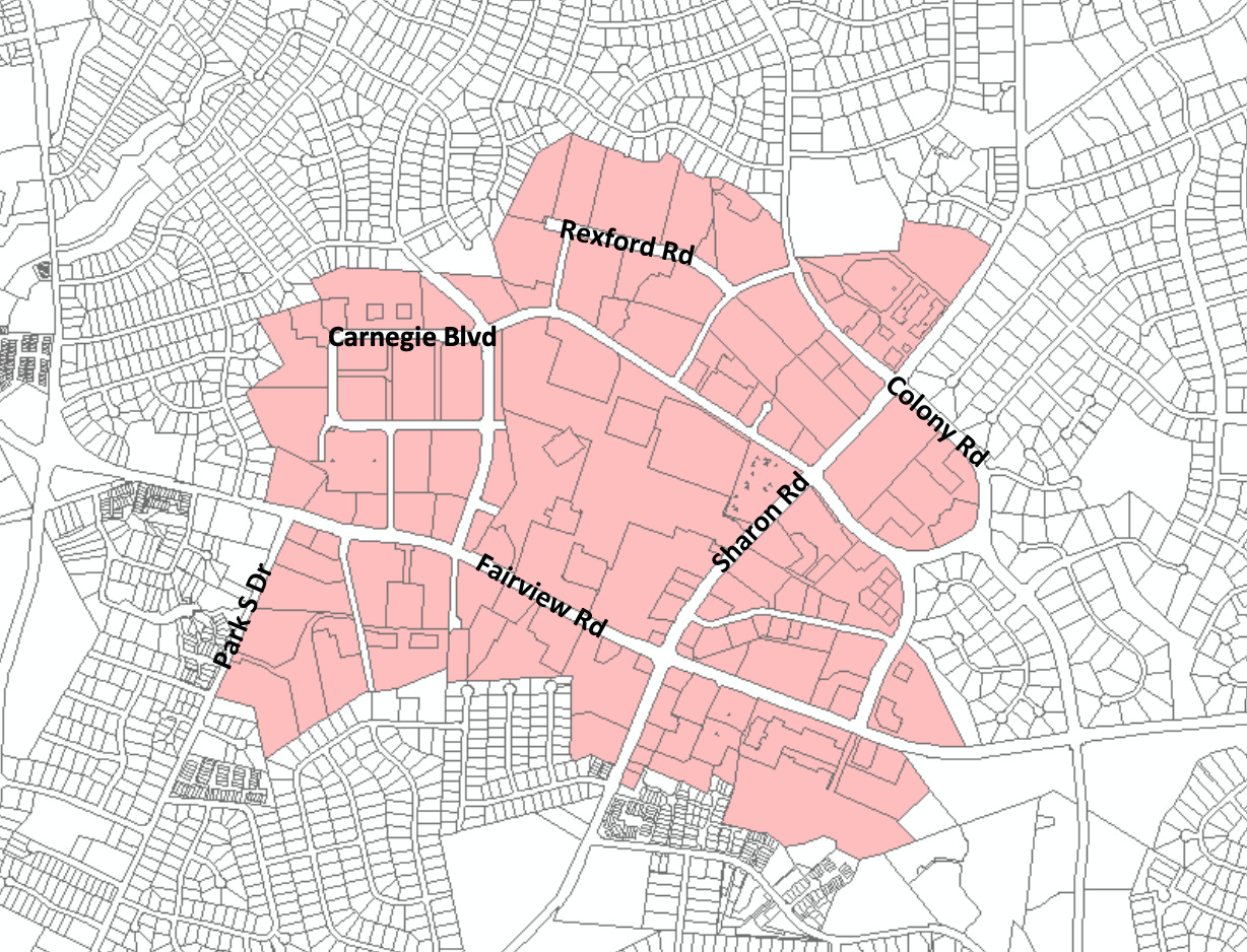The boundaries of the proposed taxing district in SouthPark encompass mostly businesses but include a few condo complexes. (Source: City of Charlotte)
