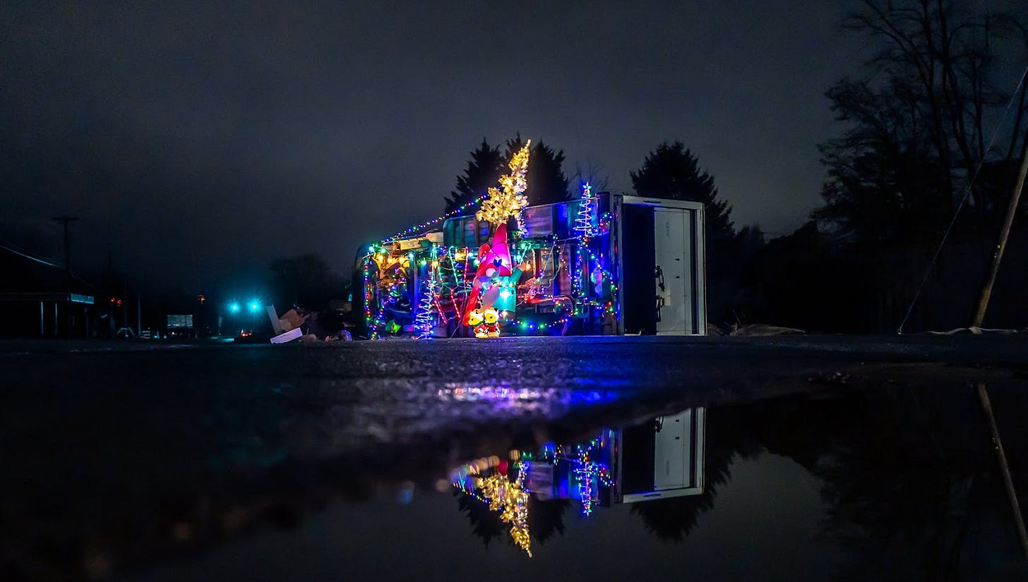 My mother, who has lived in the area her whole life and drives by the truck every day, told me that the day it’s hauled away will be a symbolic one. Not because people have grown attached to the Christmas display, but because it will be a big step in the area’s recovery.