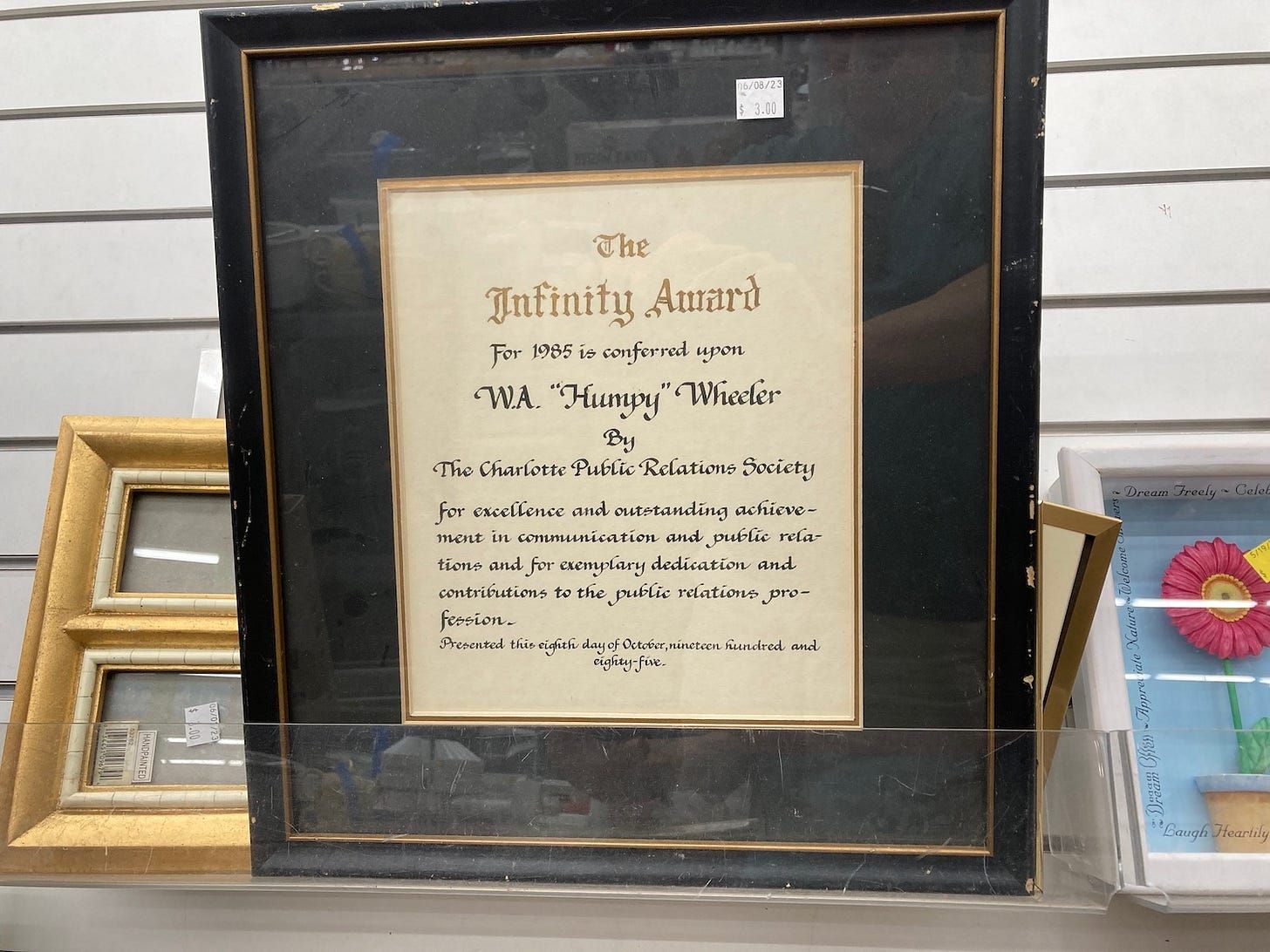 Acting on a reader tip, we found this framed award for sale at the Habitat for Humanity ReStore on Wendover Road on Saturday. It says it was given to Humpy Wheeler, the former president of Charlotte Motor Speedway, on Oct. 8, 1985, by the Charlotte Public Relations Society. Asking price: $3.