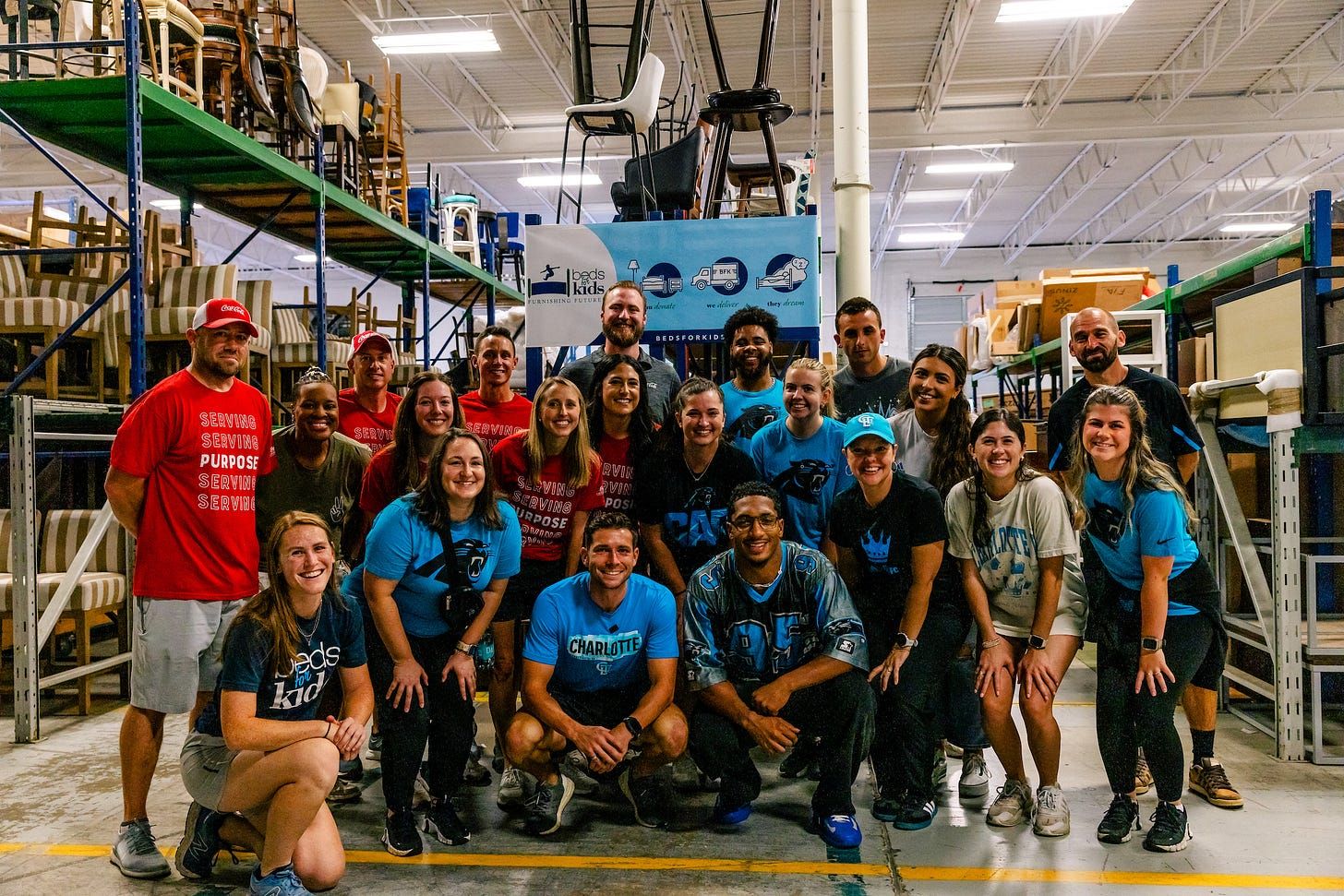 Brandt Bronico (center front row) joins Carolina Panthers running back Chuba Hubbard (to Bronico’s left) at Beds for Kids event Tuesday. (Photo courtesy of Tepper Sports & Entertainment.)