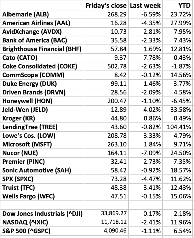Unless you are a day trader, checking your stocks daily is unhealthy. So how about weekly? How local stocks of note fared last week (through Friday’s close), and year to date:
