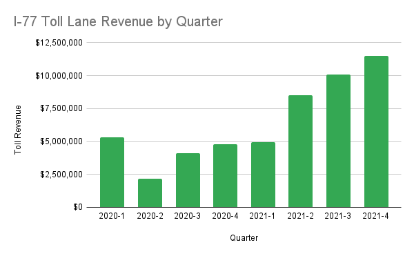 MORE CARS, HIGHER TOLLS: Between the fourth quarter of 2020 and the fourth quarter of 2021, traffic on the I-77 toll lanes rose 65%, while the amount of revenue collected was up 140%, according to figures from I-77 Mobility Partners, which operates the toll lanes.