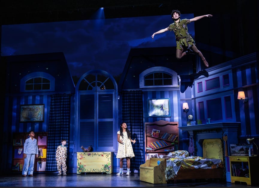 Fourth, and most crucially, deeper feelings. Somewhere amid the confetti cannons and flying somersaults, executed so handsomely here, we should pity Peter for never knowing the joys of a full adult life and shed a tear with Wendy, who realizes in the epilogue she’s too old to abandon herself to youthful fantasies. This unwaveringly cheerful, boisterous “Peter Pan” doesn’t supply either of these emotions and doesn’t expect us to miss them.