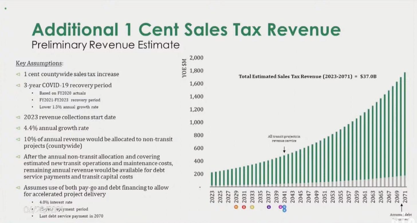 To make the numbers work, InfraStrategies has created a financing plan that spreads debt payments over 50 years. It also says sales tax revenue will come in higher than historical norms, and that costs will increase at a slower rate than what’s happened in the past.