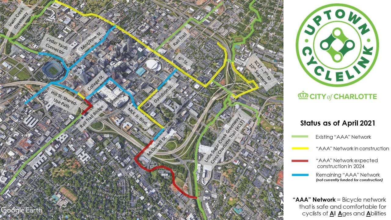 New protected bike lanes uptown are nearly complete and link to nearby greenways — greatly improving options for cycling around the center city.