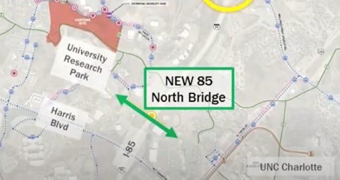 The I-85 “North Bridge” would be north of Harris Boulevard and would link the J.W. Clay light rail station with University Research Park. The city has finished design and real estate acquisition for the project and is in the process of relocating utilities before putting the project out to bid and starting construction, according to the city’s website on the project.