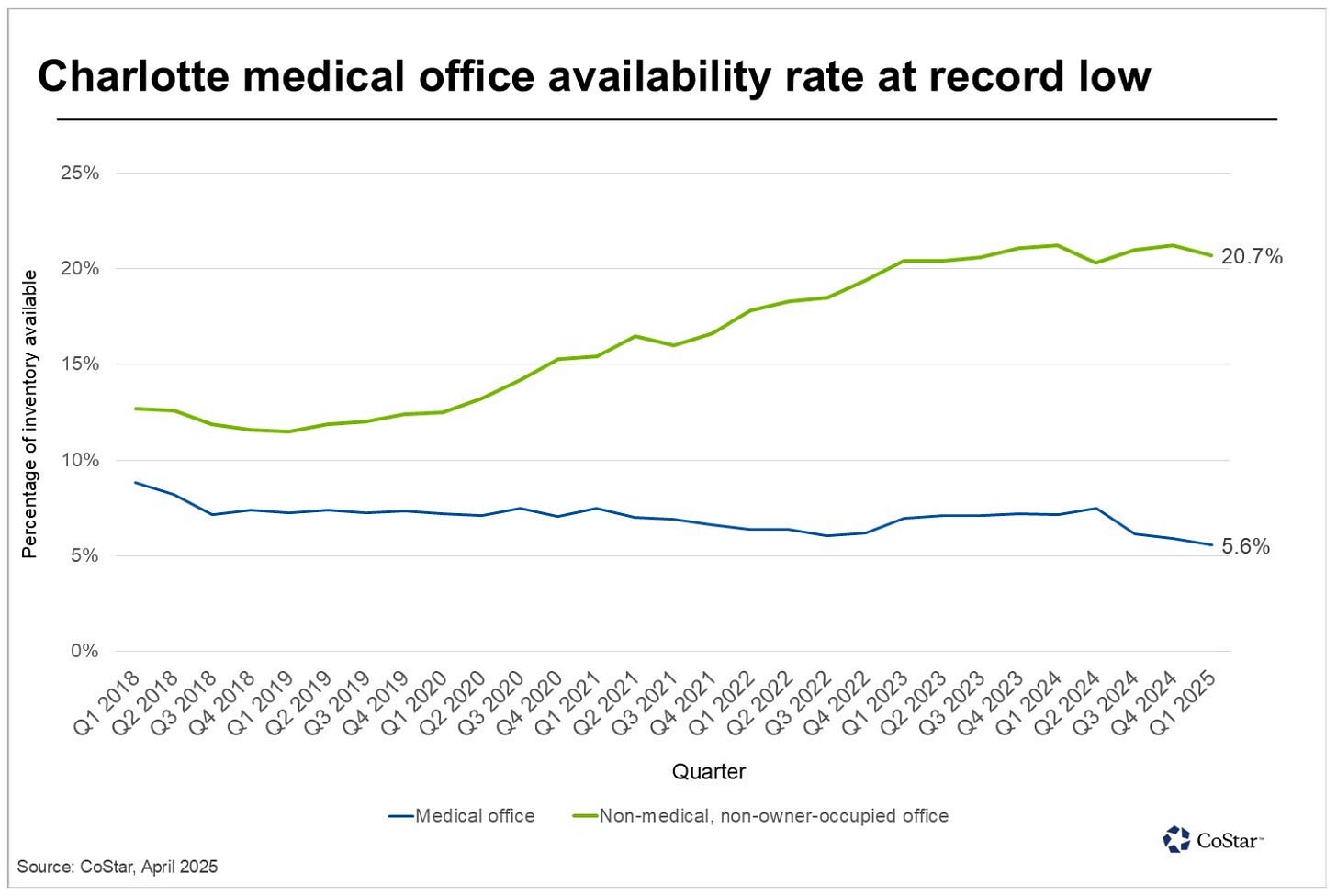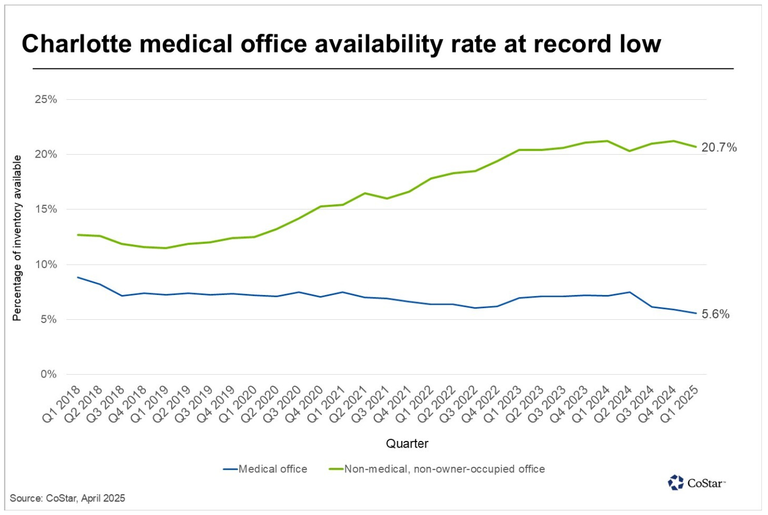 The boom in the medical office sector is reflected in the data. While non-medical office buildings in Charlotte have a vacancy rate of more than 20%, medical office vacancy rates are below 6%, according to figures from real estate data company CoStar:
