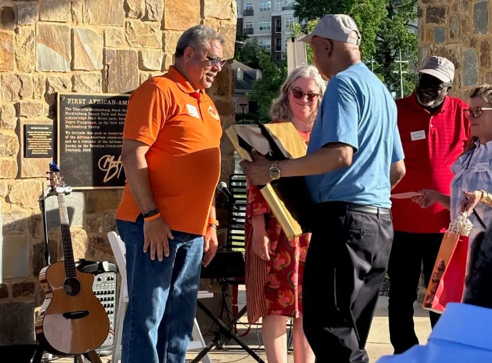Members of the nonprofit Partners for Parks honored Mecklenburg County Park and Recreation Director Lee Jones (left) for his service to the county at a meeting May 16 at Pearl Street Park. (Photo courtesy of Partners for Parks)