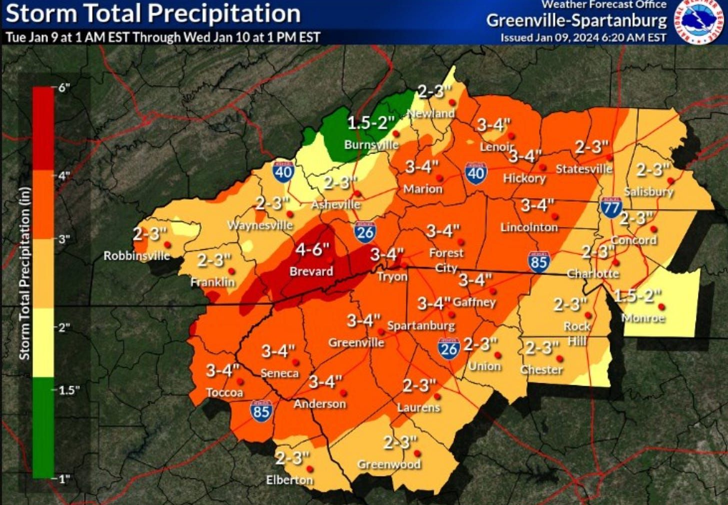 The National Weather Service is projecting about 2.5 inches of rain in Charlotte, with heavier rains starting around 10 a.m. Areas to the west will receive more.
