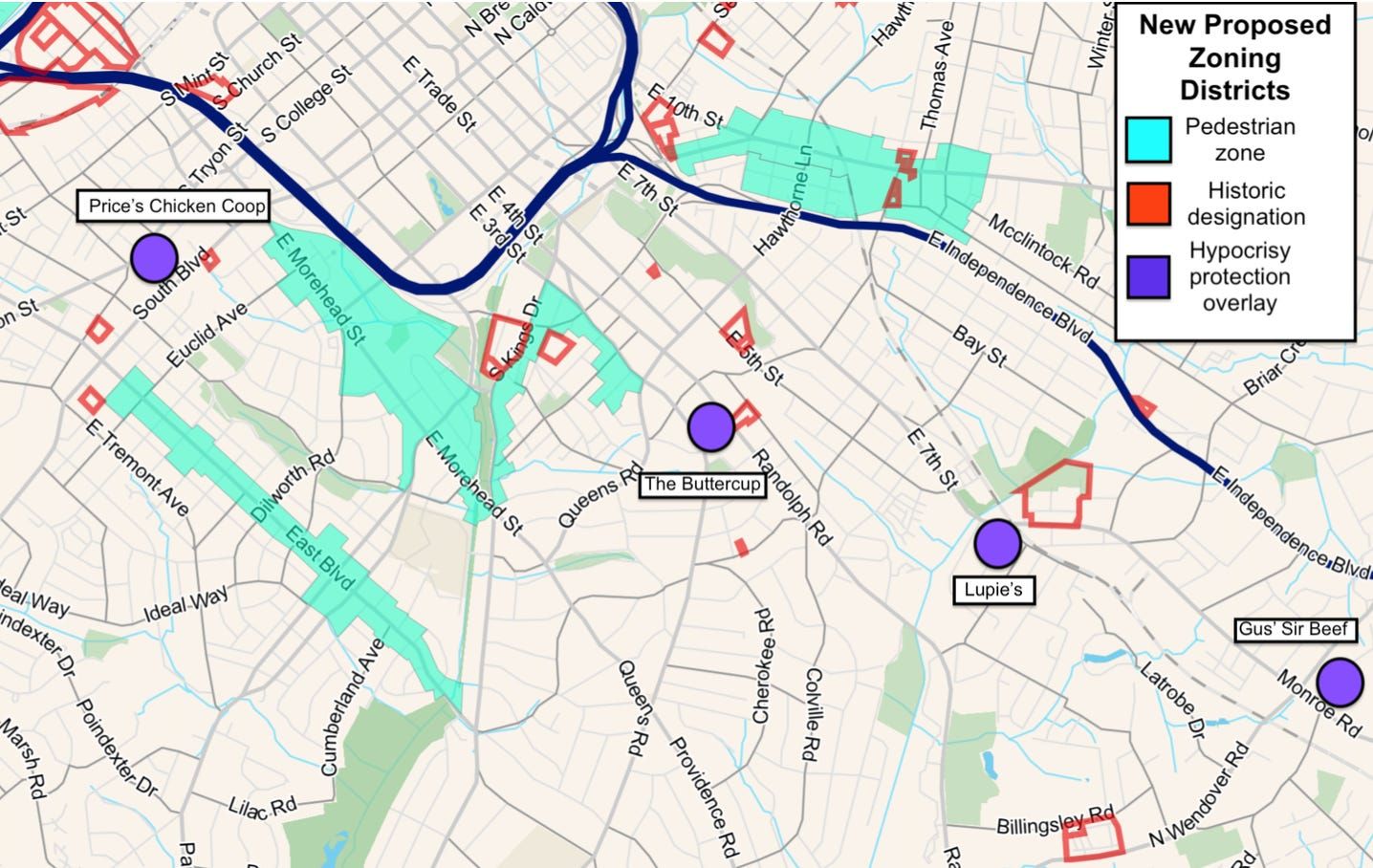 A new zoning designation, to be called the “Hypocrisy Avoidance Overlay District,” would be established to outlaw the closings of certain longstanding businesses. That would spare Charlotte residents feelings of guilt for not having been to those businesses in more than a decade, as well as avoid overly sentimental social media posts from those people.