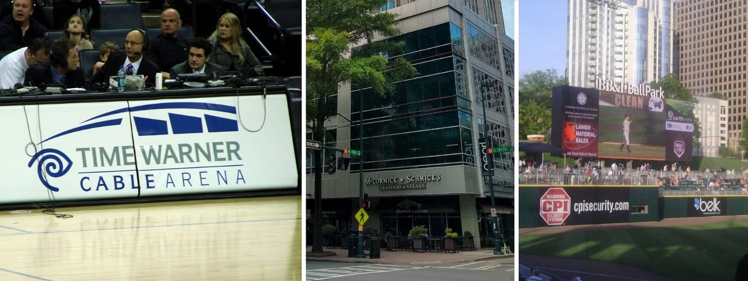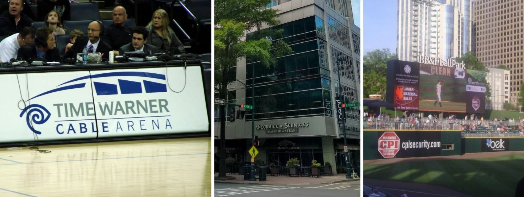The Spectrum Center was formerly known as the Time Warner Cable Arena (from left), back when the Charlotte Hornets were the Charlotte Bobcats. McCormick & Schmick's restaurant was located at 200 S. Tryon St. in uptown, and Truist Field was known as the BB&T BallPark back in the day. (Time Warner photo courtesy of Gregor Smith on Flickr, McCormick & Schmick's photo courtesy of Wikimedia Commons and BB&T BallPark photo courtesy of Wikimedia Commons)